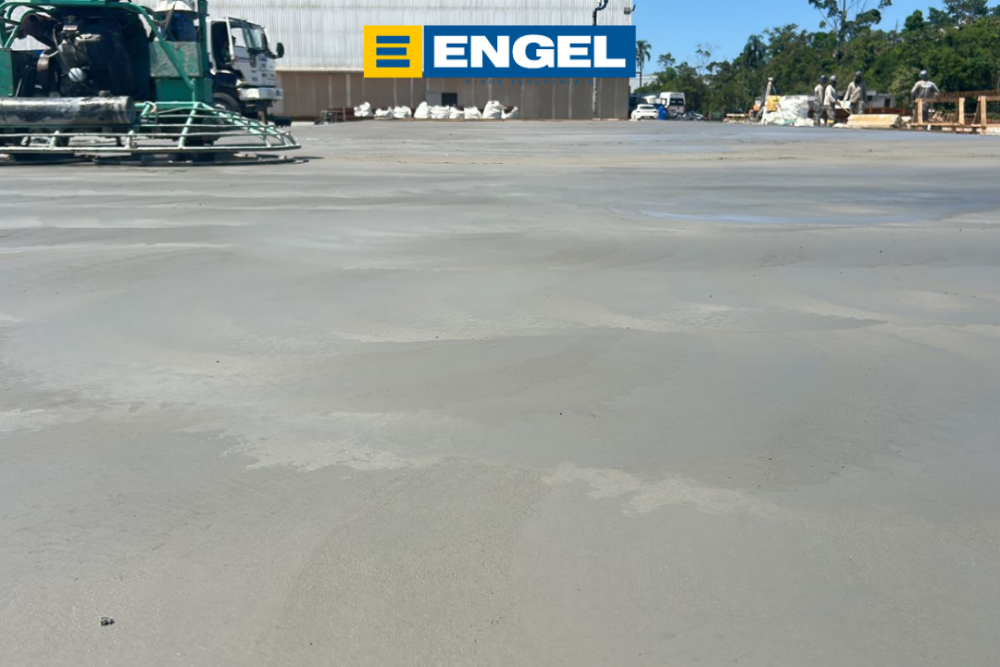 Piso industrial com adição de Macrofibra Sintética e aplicação de endurecedor de superfície.